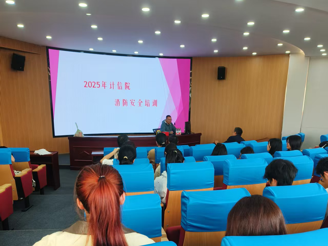 演练前,校保卫处消防科徐杰科长在学院三楼报告厅对全体师生授课培训,向师生讲解了火灾成因、初期火情扑救方法、逃生路线选择,并现场演示了灭火器“提、拔、握、压”四步操作法。