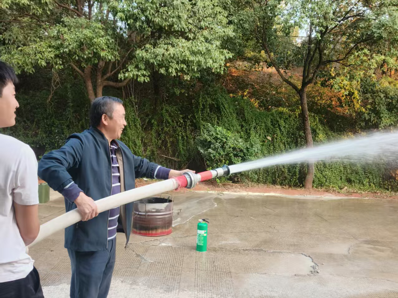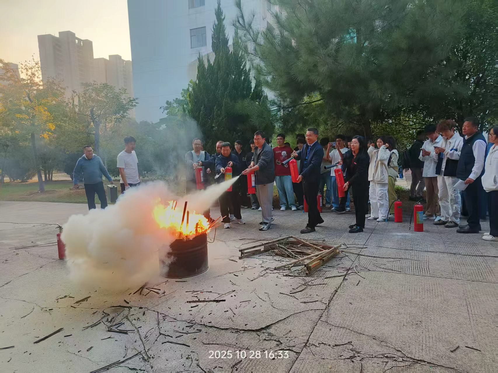 下午4时,演练开始。首先进行了火灾逃生演练。烟雾报警器触发后,在博学楼的师生们用湿毛巾捂住口鼻,弯腰低姿沿疏散指示标志撤离,全程保持安静有序,快速完成了所有人员向室外安全区域的集结。随后,在博学楼东面场地上,开展了火灾扑救演练。师生依次实操使用灭火器,共同扑灭火起火点,校保卫处工作人员对操作不规范之处予以实时纠正。最后,校保卫处工作人员对如何使用消防水栓进行灭火进行了现场培训指导,进一步巩固演练效果。