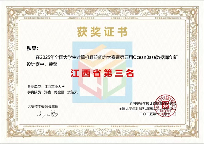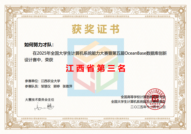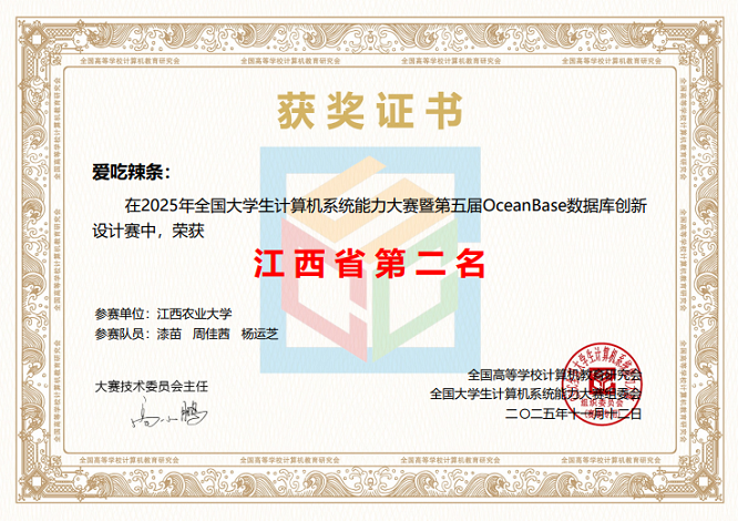 近日,2025全国大学生计算机系统能力大赛暨第五届OceanBase数据库大赛落下帷幕。由计算机与信息工程学院彭军老师指导的3支学生队伍取得省级奖项。其中,爱吃辣条队(队长:数据2304漆苗、队员:数据2304周佳茜、计科2304杨运芝)获得江西省第二名,如何努力才队(队长:数据2303邹慧仪、队员:数据2303郭婷、数据2302张雅萍)和秋果队(队长:数据2303汤鑫、队员:林化2301傅金昱、数据2305贺佳天)获得江西省第三名。