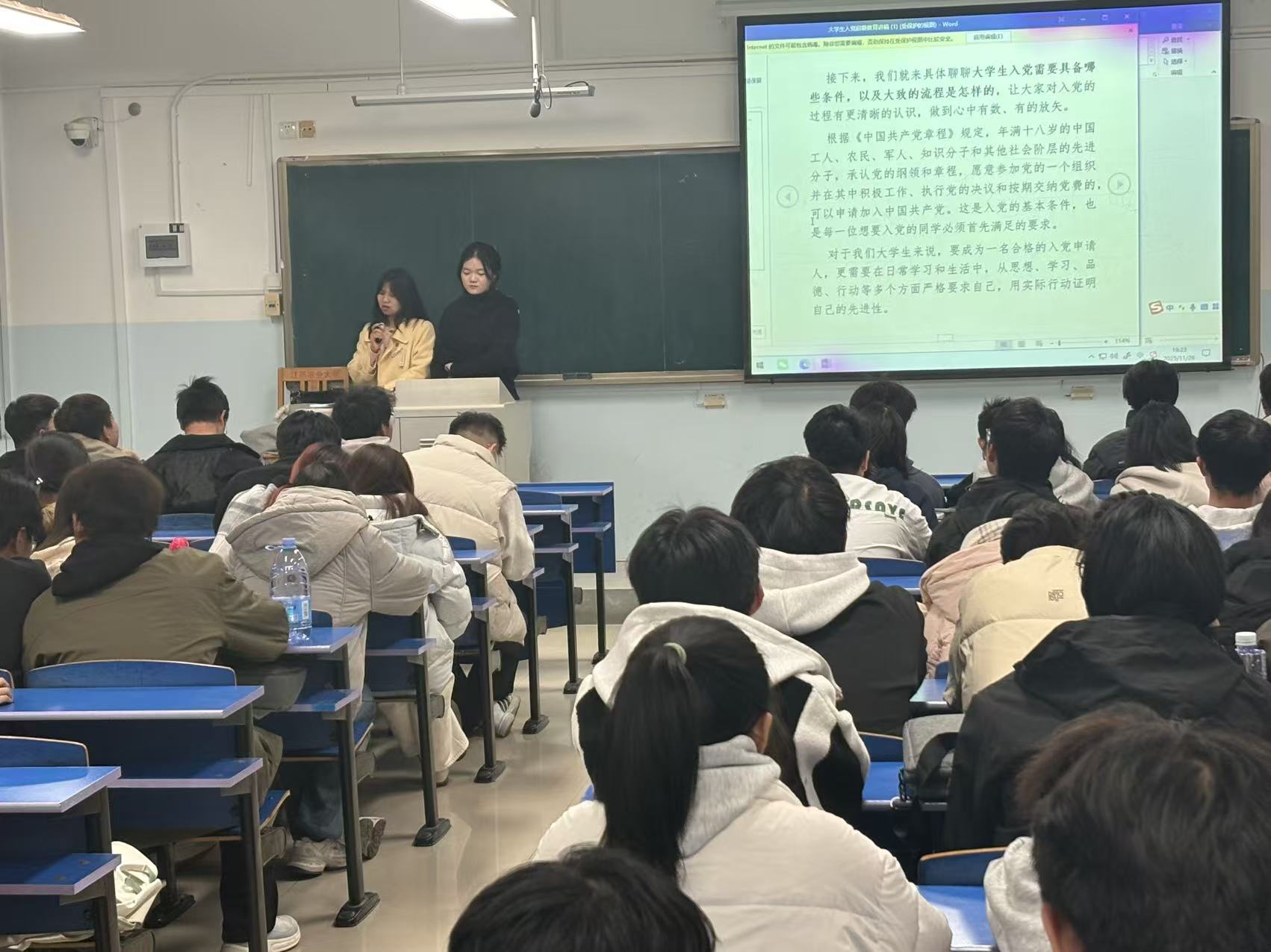为深入贯彻落实新时代党的建设总要求,扎实推进党员发展工作,帮助新生扣好“思想第一粒扣子”,在学院党委统一部署下,11月26日,我院本科生各党支部在第五教学楼同步开展了入党启蒙教育活动。本次活动面向2025级全体新生,利用晚自习时段,支部党员代表以“面对面交流、心贴心引导”的形式深入到各班级,让入党启蒙教育融入走进大学生校园学习生活。