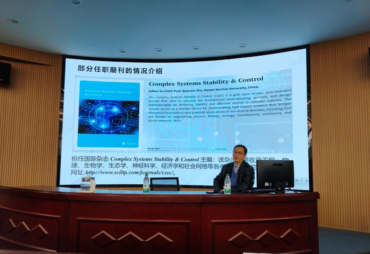 朱全新教授以“随机方程的理论突破与青年学者的学术论文写作”为主题,聚焦随机方程的理论突破和应用探索等方面,阐述了随机非线性系统研究的最新进展情况。朱全新教授基于编委与审稿人的丰富经验,从选题要“准”、框架要“清”、写作要“精”、投稿要“稳”四个环节,为学院青年学者进行学术论文写作指导。与会人员就关心的问题与朱全新教授进行了咨询交流。