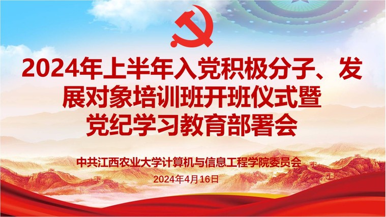 4月16日晚,在雄壮的国歌声中,我院2024年第一期入党积极分子与党员发展对象培训班开班仪式暨党纪学习教育部署会在院办三楼报告厅举行,学院党委书记杨峰出席会议并作开班讲话,学院党委副书记、院分党校校长李雅琼主持开班仪式,各学生党支部支委及全体入党积极分子与党员发展对象培训班学员共150余人参加。